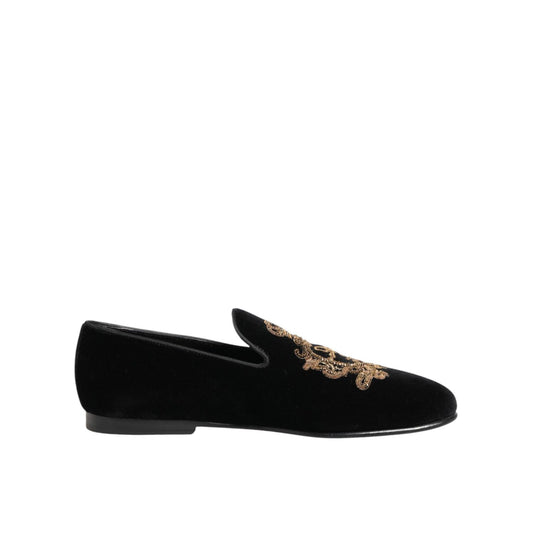 Dolce & Gabbana Black Velvet Gold Crown Mens Loafers Shoes