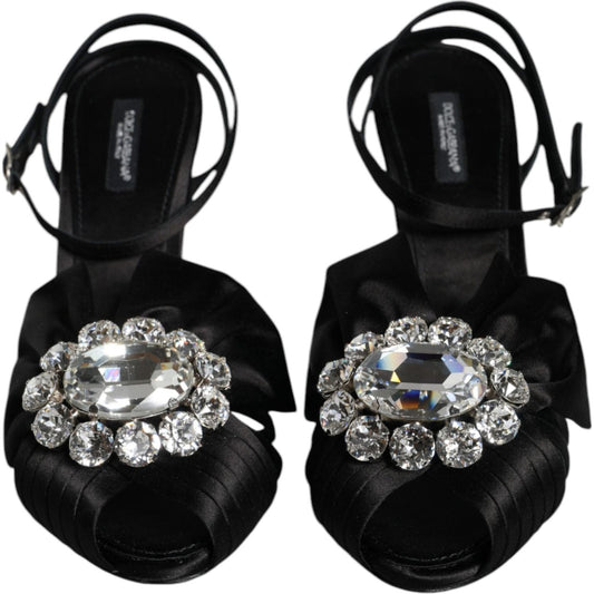 Dolce & Gabbana Black Leather Crystal Bow Heels Sandals Shoes